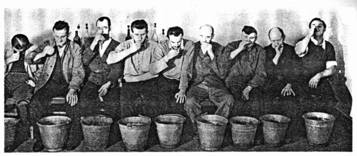 Overt sensitization treatments using nausea-inducing drugs, not just imagination, were tried in the Soviet Union as early as the 1930s. A Soviet psychology text from the 1930s shows a line of men sitting on little stools, each with a metal bucket between his knees, each drinking something out of a shot glass.